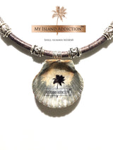 My Island Addiction Brand, artisan shell choker necklace with beautiful sunset "Halo" ring collected from Sanibel Island, Florida.