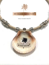 My Island Addiction Signature Brand, artisan shell choker necklace with sunset "Halo" ring collected from Sanibel Island, Florida.