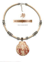 My Island Addiction Brand, artisan shell choker necklace with orange glow "Halo" ring collected from Sanibel Island, Florida.