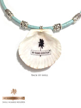 This Sanibel choker necklace is the first in this series with its all natural aqua blue bamboo cork cord, that comes adorned with detailed beads made of Zamak, 925 Sterling Silver, Stainless Steel, includes Zamak Lobster Clasps, and extension chain. Shell is coated to preserve color, and give strength to shell.